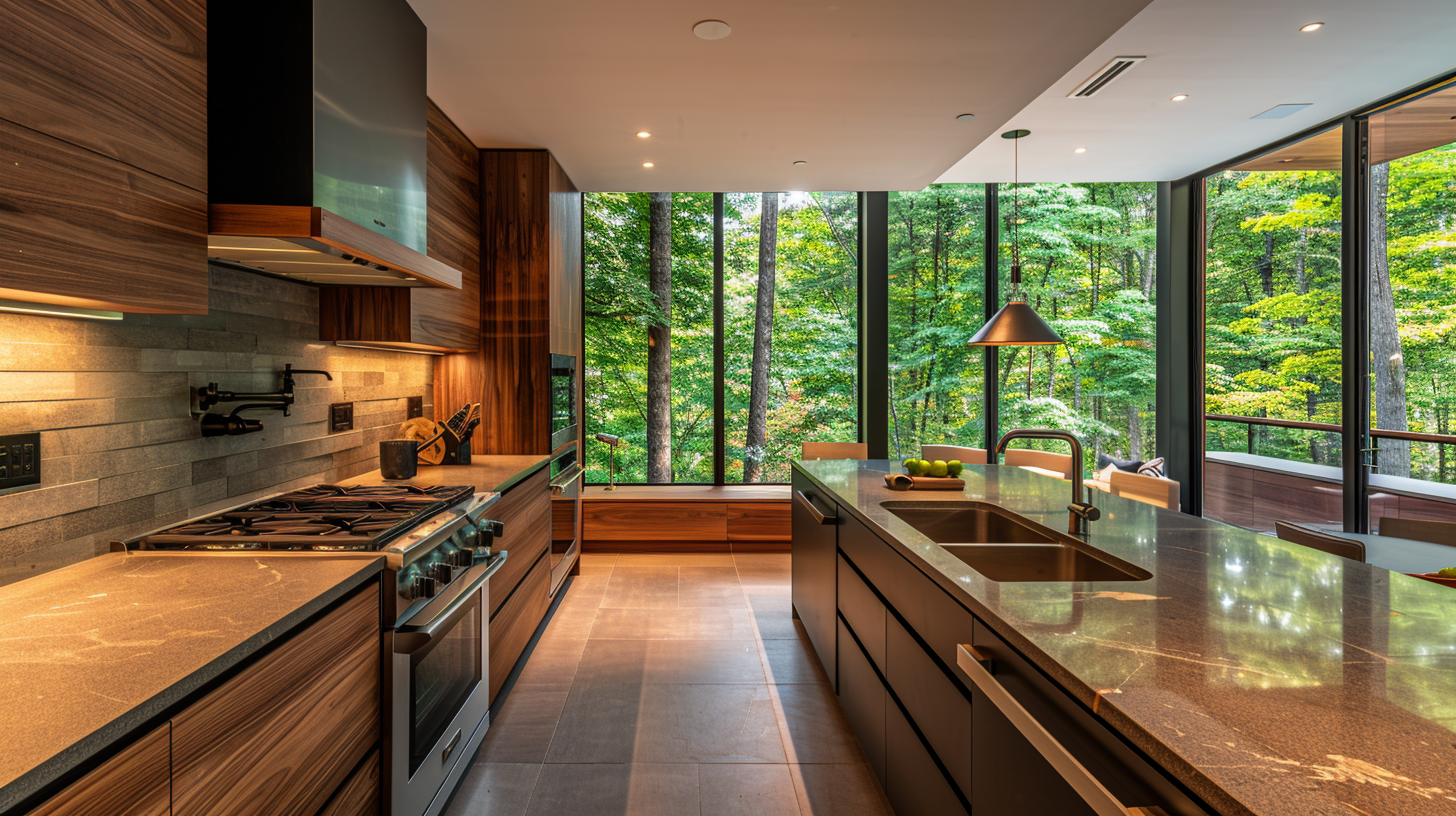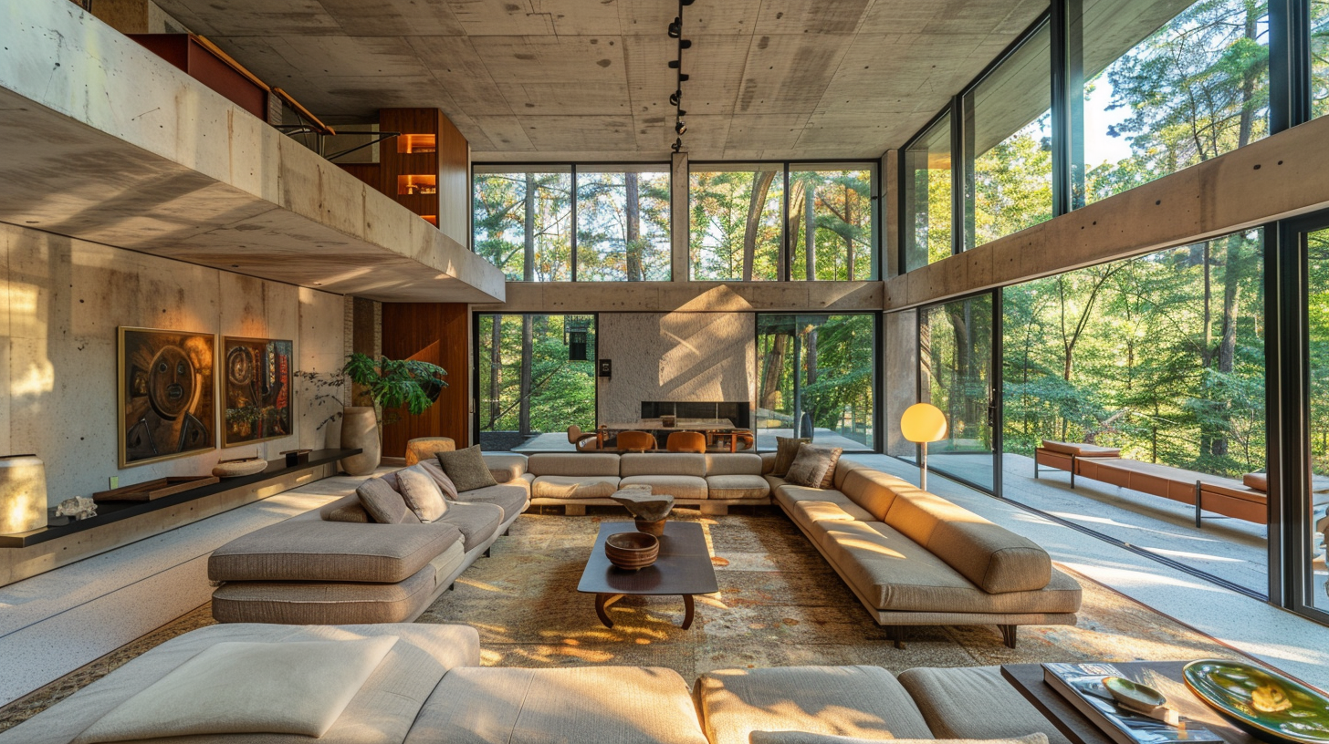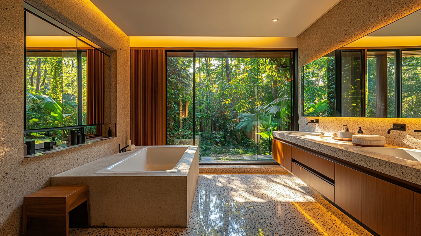 In The Woodland Residence verschmelzen Naturverbundenheit und modernes Understatement zu einem einzigartigen Zuhause. Terrazzo, Sichtbeton und edles Walnussholz schaffen eine luxuriöse Wohlfühlatmosphäre mit maximaler Privatsphäre.